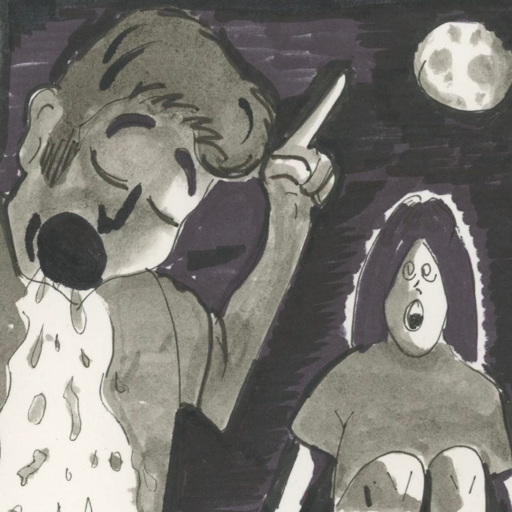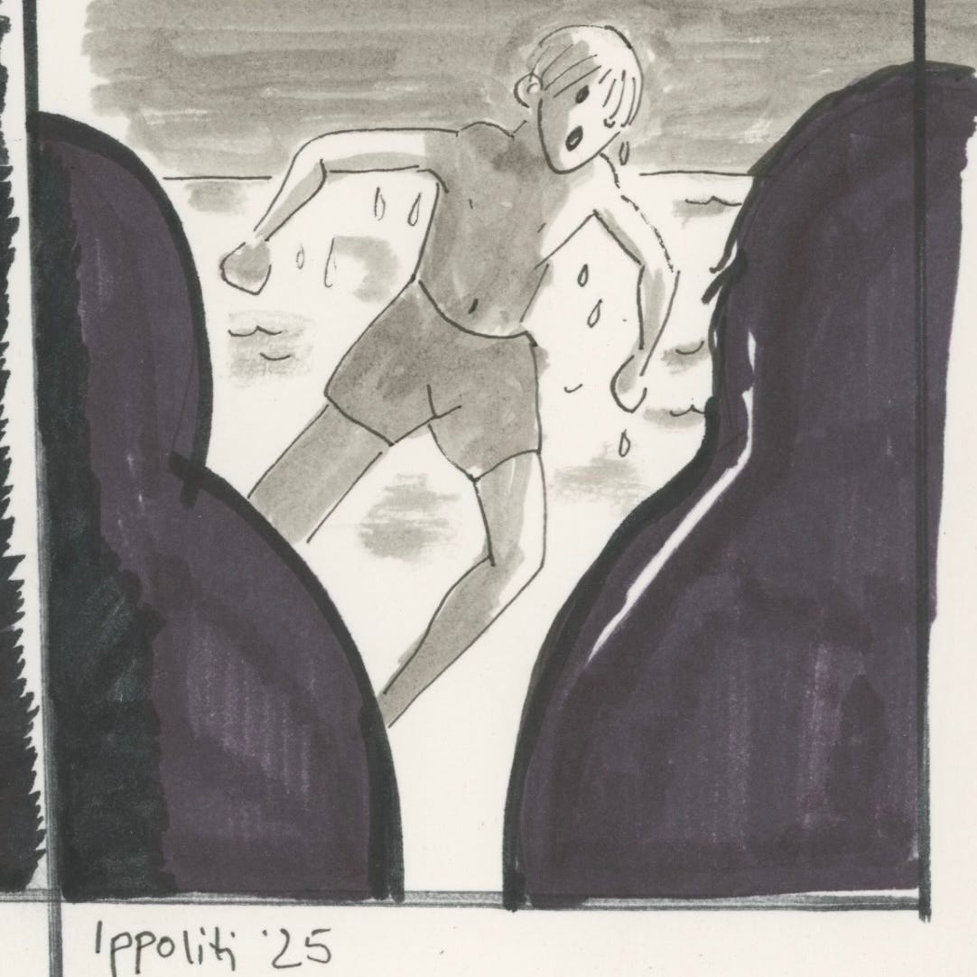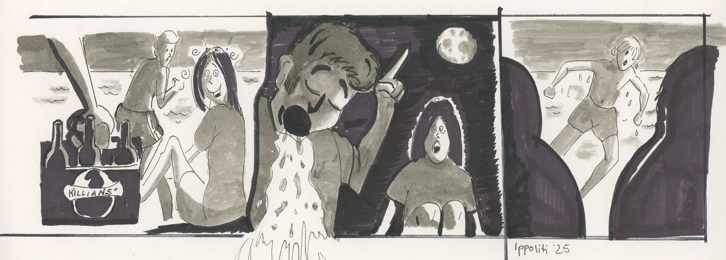 This whole thing became a cartoon idea I’d been sitting on for a while. I wanted to draw it the way it still exists in my mind. Most memories aren’t movies—they’re snapshots. Unless it’s something monumental, like Kennedy’s assassination or 9/11, we remember in flashes. These three panels are my flashes: the beer on the beach, Sean puking, and Joe emerging from the sea.