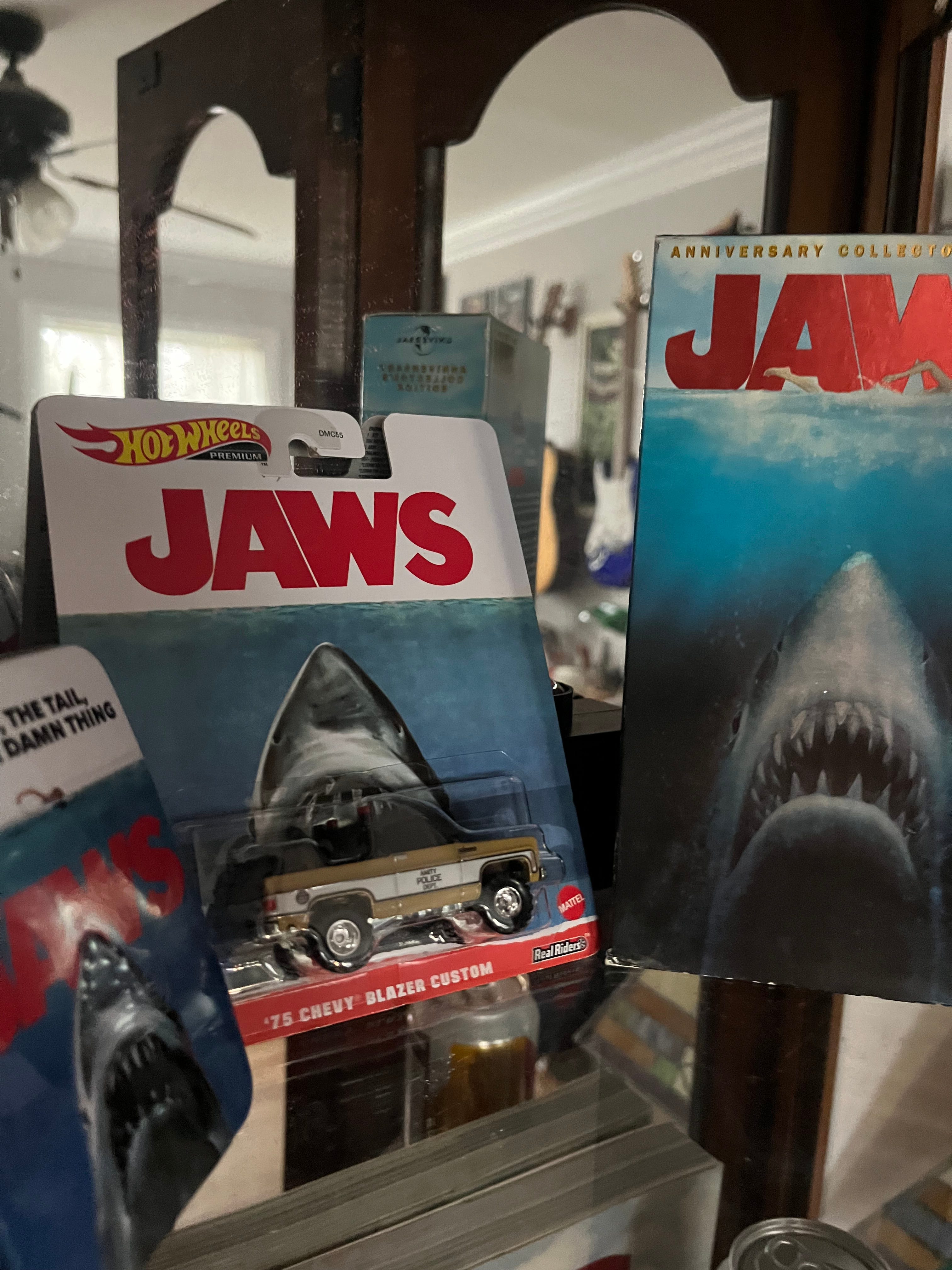 I have some fantastic friends. Last night, my friend Jon surprised me with Sheriff Brody’s truck from the movie JAWS. This is a very hard-to-find Hot Wheels that I have been looking for for months with no luck. Jon spotted it in Macy’s and thought of me. It now has a space in my JAWS collection curio cabinet.