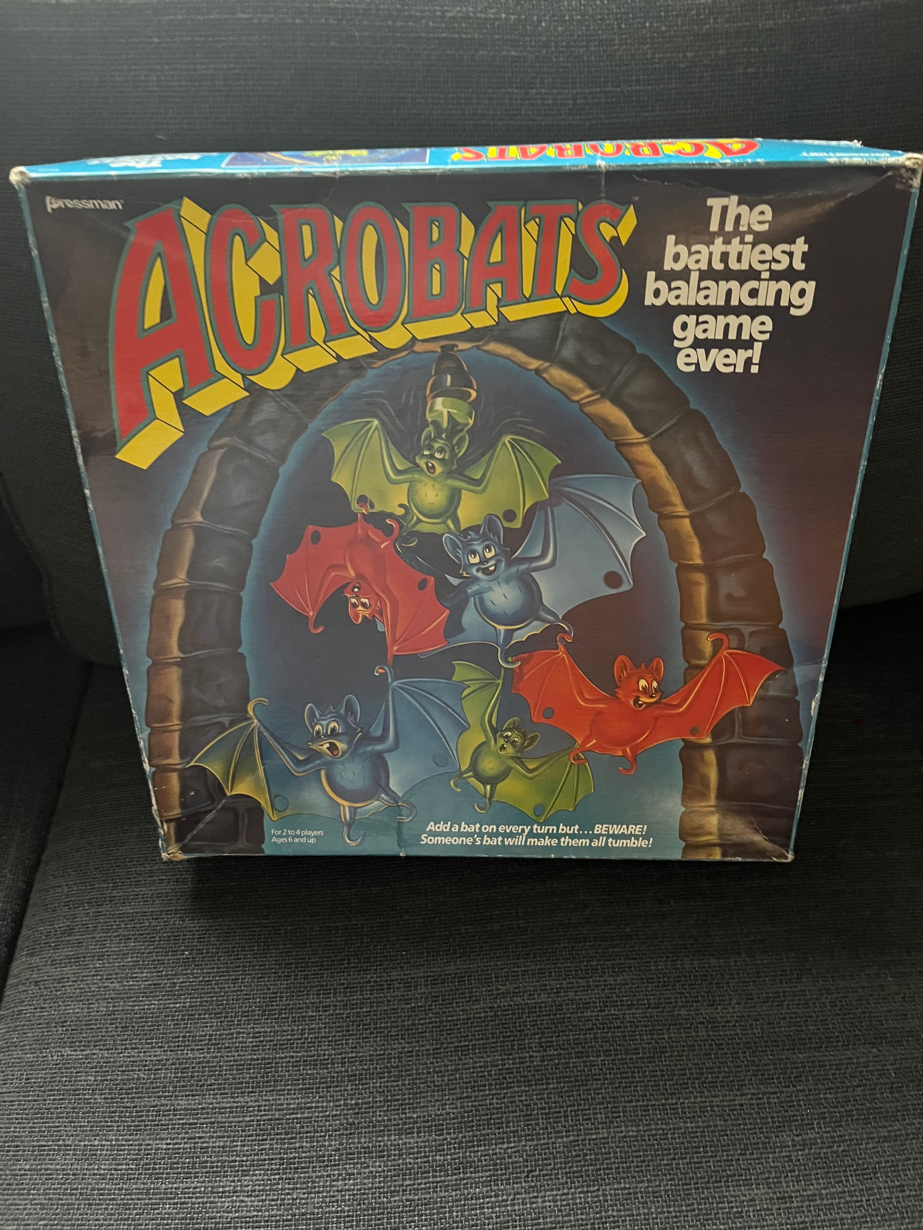 Last week, I forgot to post my latest thrift store find. Ladies and gentlemen— the game ACROBATS from 1986. I am a sucker for vintage board games, especially when they have dark themes like bats in a cave. I bring them home to play with my boys.
