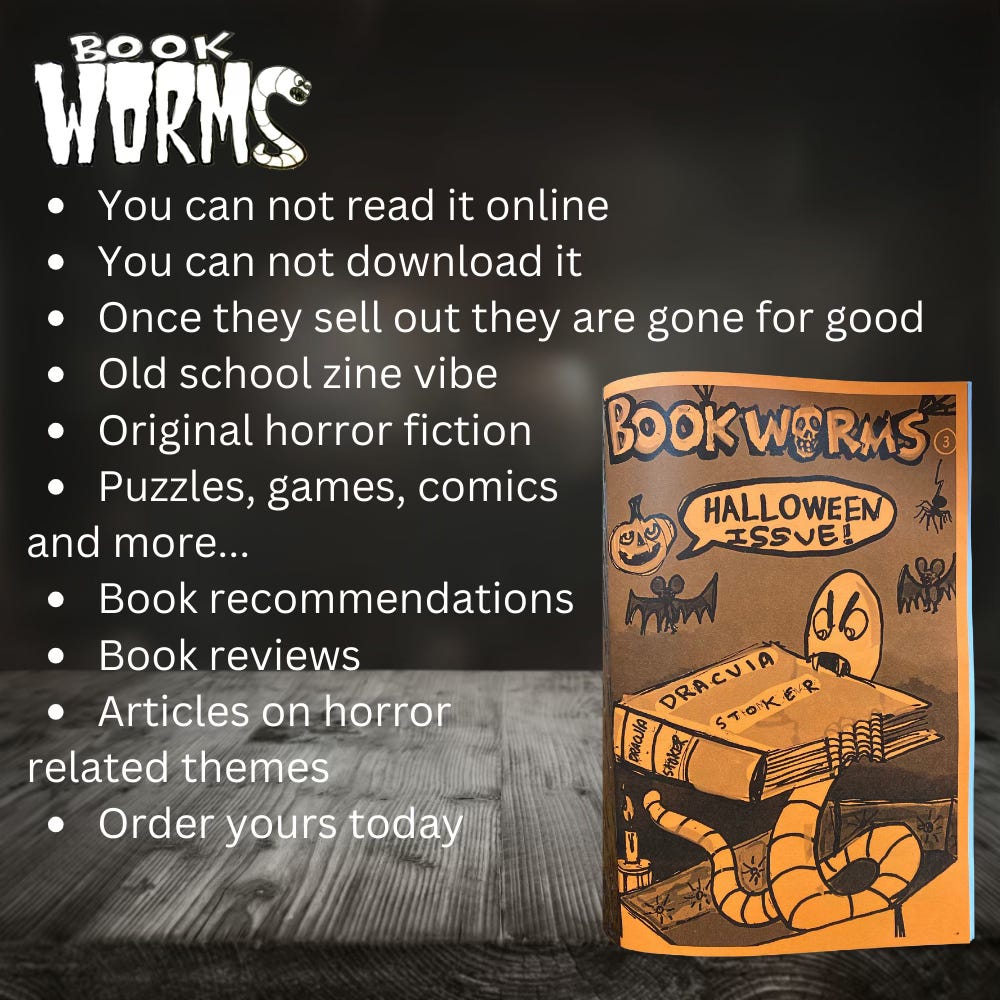The third issue of Book Worms Horror Zine is going fast. The issue features new artwork by Charles Radcliffe, original horror fiction by Cameron Chaney, JG Faherty, Valerie Hunter, and e rathke, a list of Halloween reads by Elizabeth Sagewood, the History of Ben Cooper Halloween costumes by yours truly, a book review by Regina Saint Claire, a word search, a riddle, comics by myself and Regina, a boardgame centerfold, and as always the Ask Dr. J column. The Book Worms Horror Podcast will resume this week. I missed a few weeks due to my health. You don’t want to miss this spectacular spooky issue. Click below to buy your copy today.