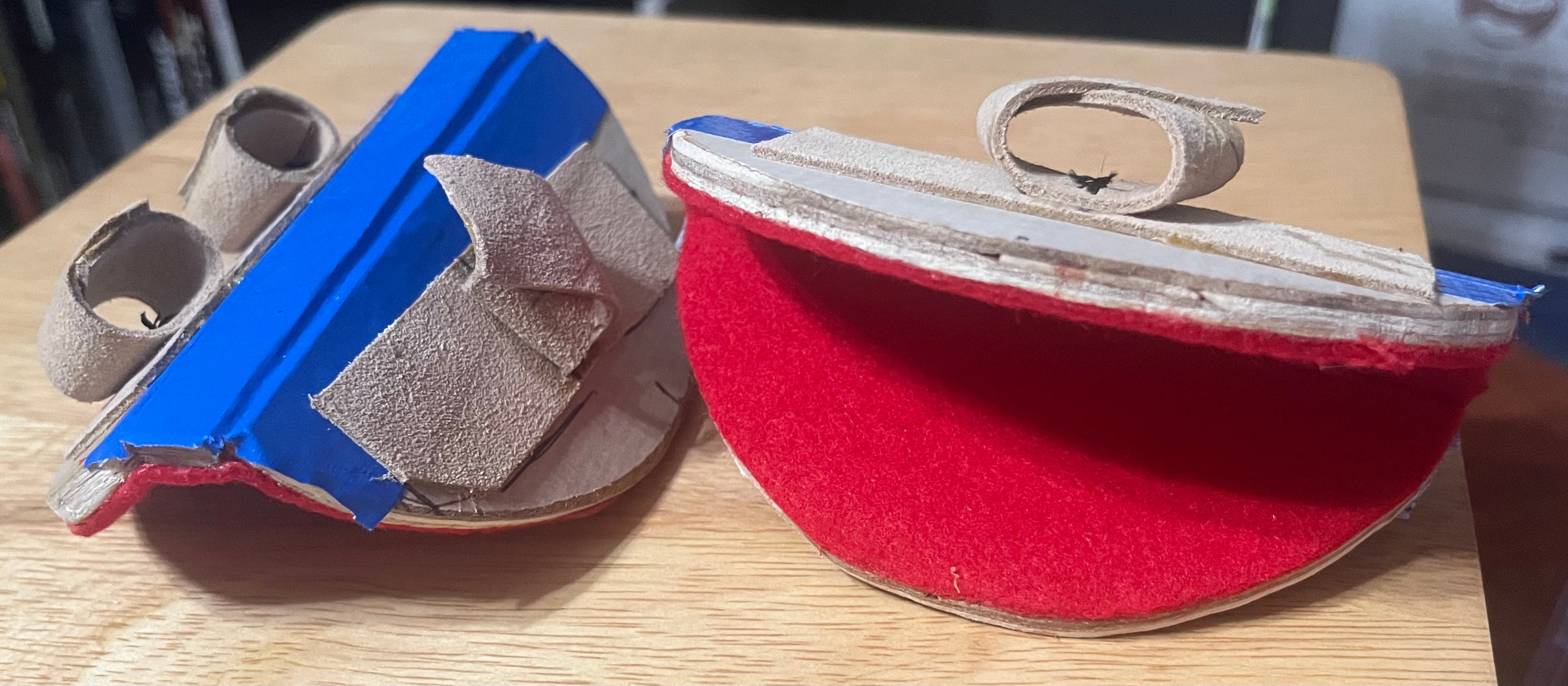 The photo above might look like two bizarre-looking monsters but in actuality, they are the mouths of two puppets. As I mentioned in last week’s newsletter, my son and I are working on creating our own muppet-style puppets. It’s hard to see all the work that went into making just one of these mouths. First, I needed to cut the wood for the top and bottom of the mouthpiece. I don’t have a bandsaw…or a jigsaw… or any real kind of saw so I ran out and bought a cheap coping saw to make the cuts. It wasn’t easy. We went to Home Depot for the wood. We picked up the red felt & suede for the finger loops at Joanne Fabric. I actually had quite a bit of scrap leather but I think my one son threw it out while making space for his LEGO. Barge contact cement was used for all the gluing. The finger loops were also hand-sewn to make the loops stay strong. It’s important to remember that these will be inside the head of the puppet so it doesn’t need to look pretty. It just needs to function, which they both do really well. I will continue to report on the progress each week.