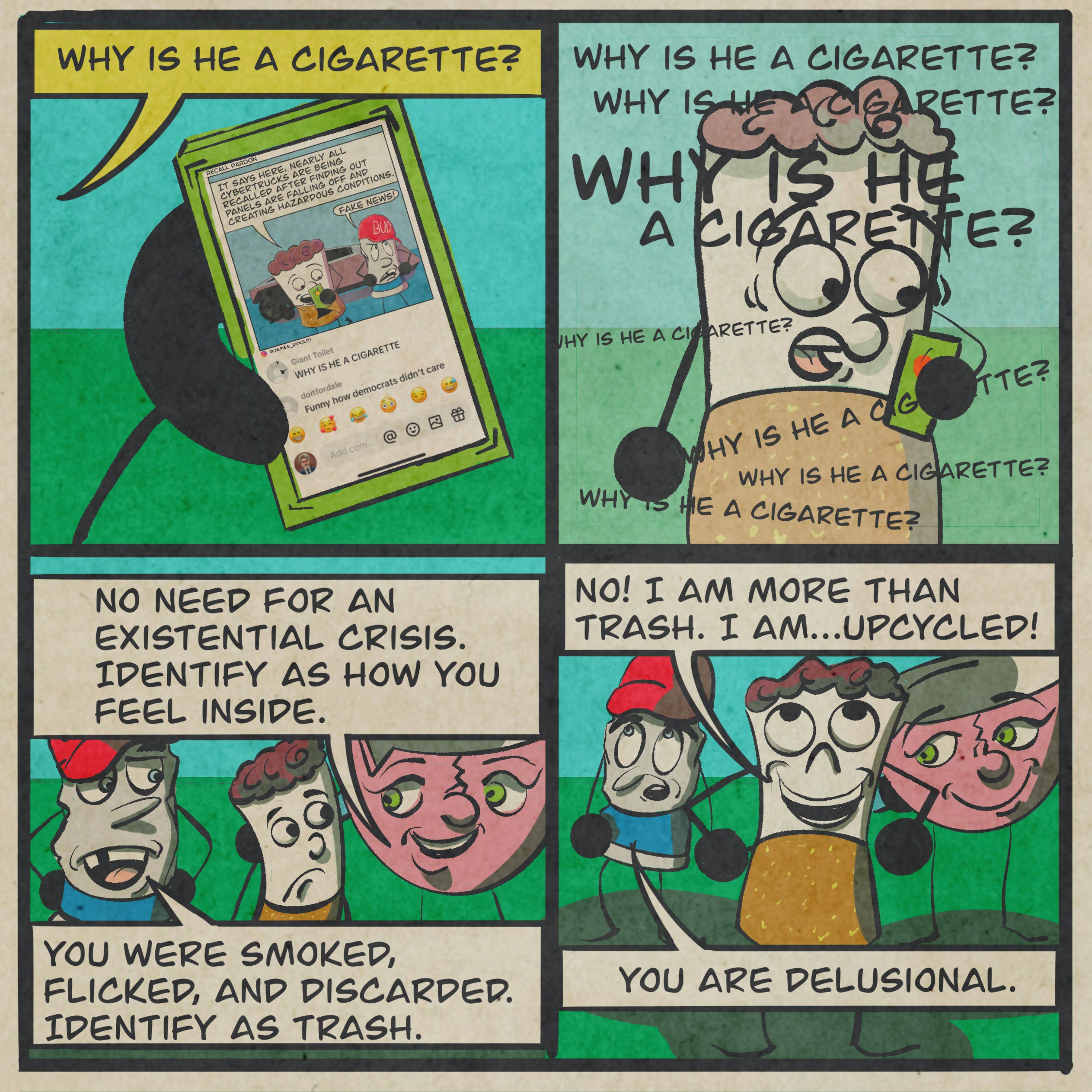 Bud, Nick, & Joe is a satirical comic strip featuring three roommates who just happen to be literal trash. Bud, a crushed beer can, is an unapologetic, politically incorrect troll who embraces MAGA culture and outrage politics. Joe, a broken coffee mug, is a self-righteous leftist who takes moral grandstanding to the extreme. Stuck in the middle is Nick, a cigarette butt, who remains politically apathetic but tries (and usually fails) to be the voice of reason.