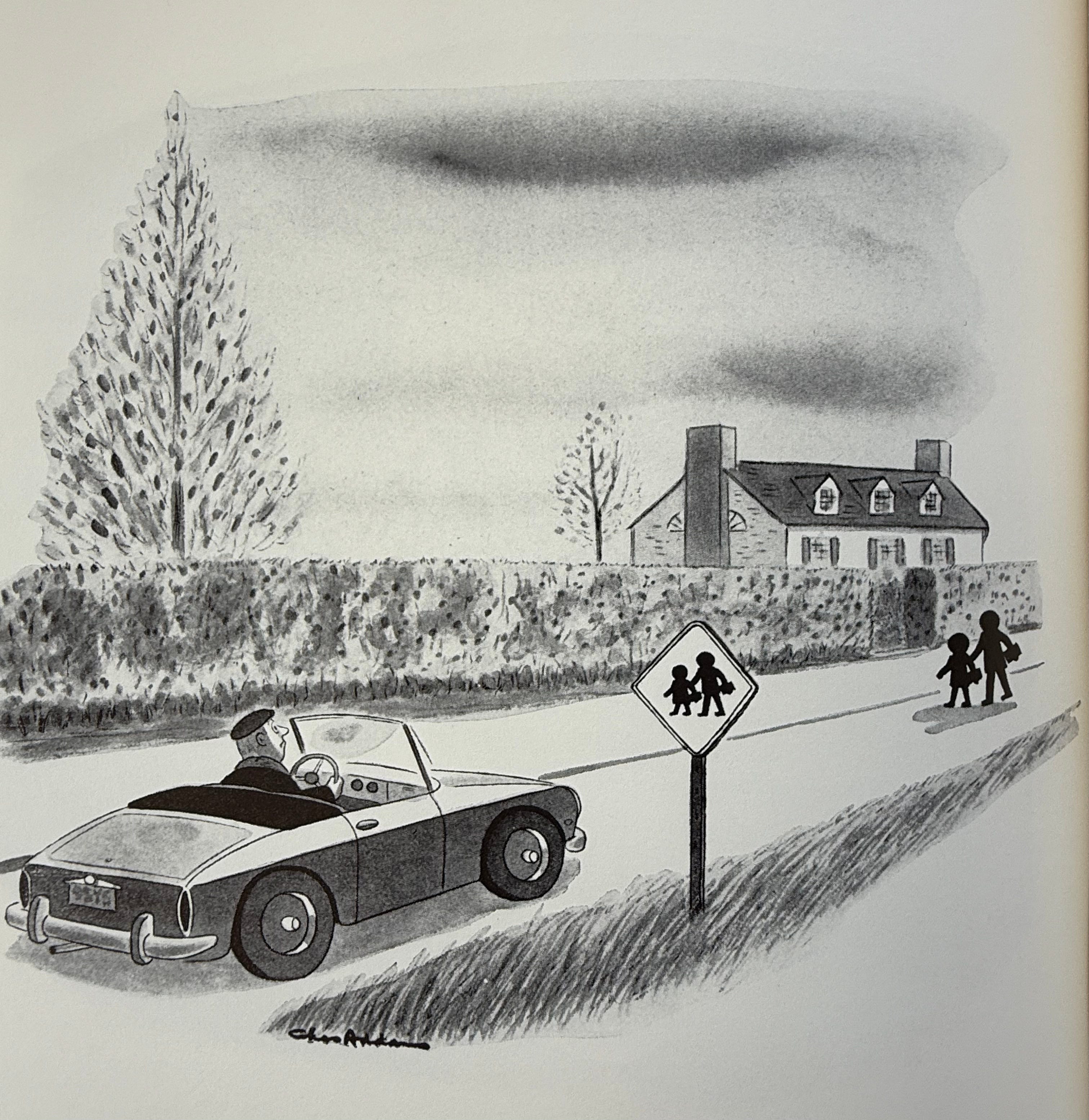 Recently, I had one of those serendipitous moments that keep me going. I came across a Charles Addams cartoon and nearly dropped my pen. The gag? Almost identical to one I drew many, many years ago (which has been lost to time). The setup, the payoff—everything was the same, except mine had a modern twist (the sign, to be specific). I had no idea at the time, but apparently I’d been channeling the great Addams without knowing it. That kind of accidental parallel thinking made me weirdly happy. Like, “Hey, maybe I am on the right track.”