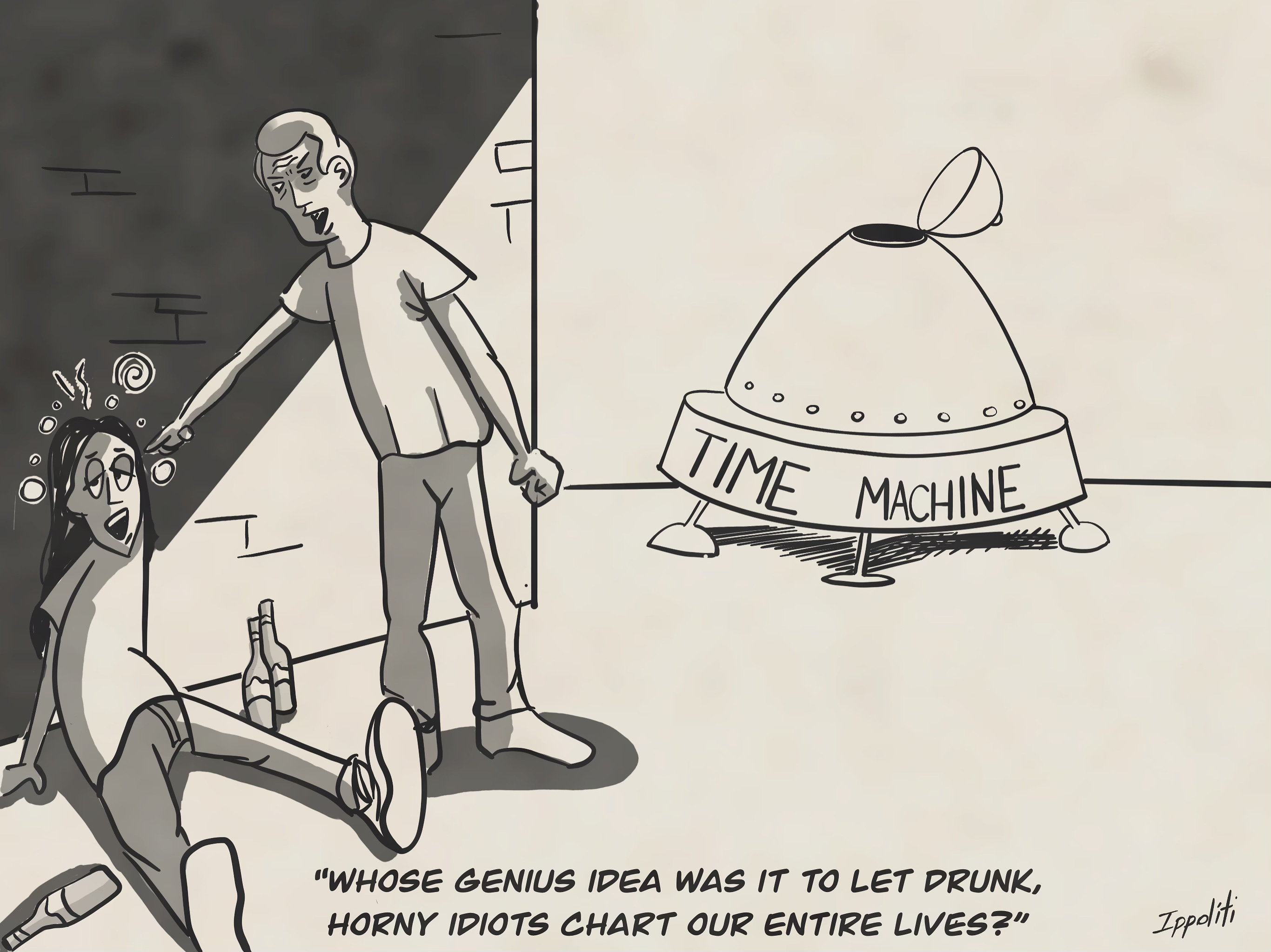 I was mid-rant, complaining that the design of life seems fundamentally flawed. Why is it that the younger versions of ourselves—naive, hormonal, broke—are the ones making decisions that define the lives we’re stuck living later on? It’s madness. My therapist chuckled and said, “You should draw that as a cartoon.” Challenge accepted.