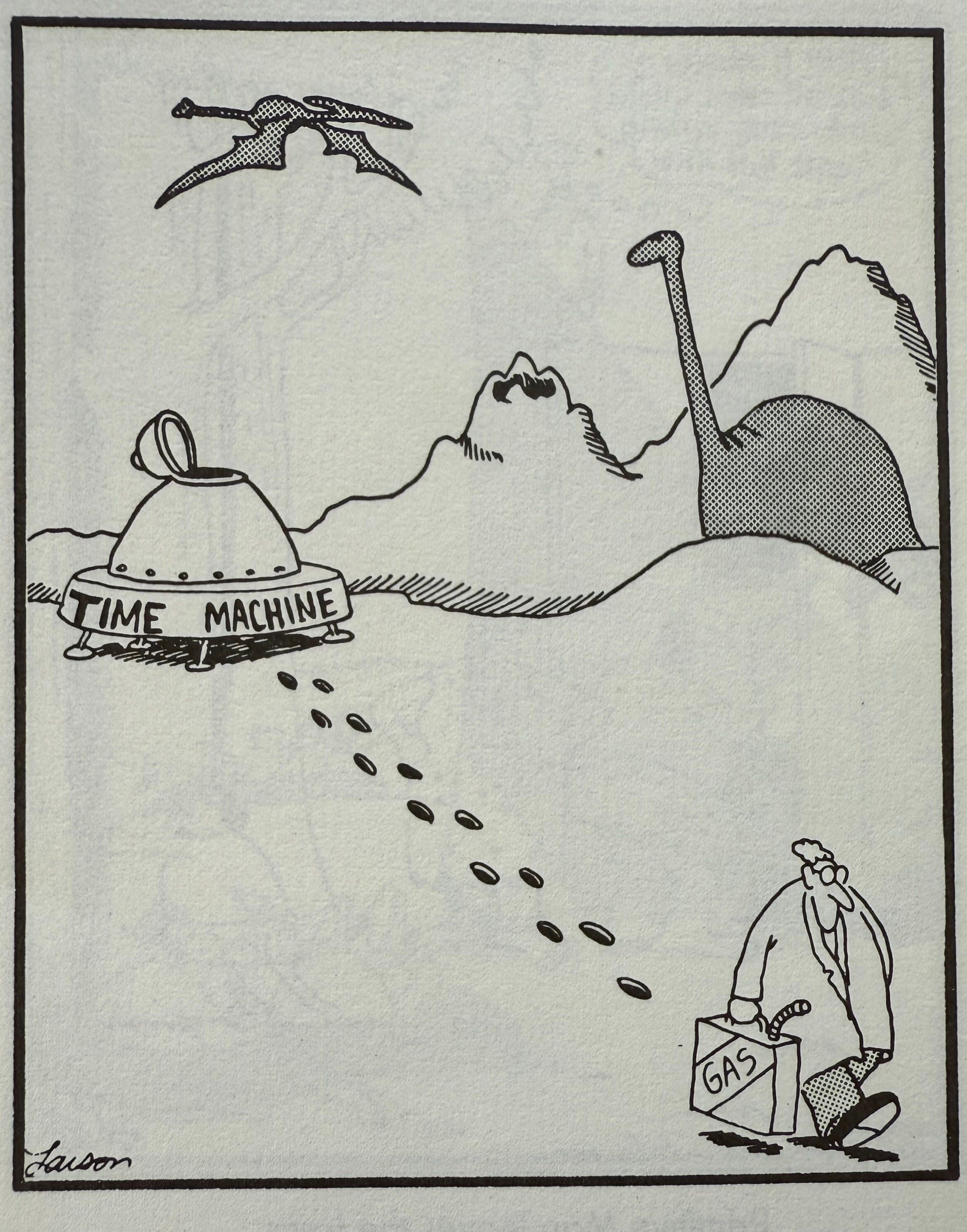 In the cartoon, the older me confronts the younger me via a time machine. (And yes, if you’re a nerd like me, you might recognize that the time machine is the same one from a classic Far Side cartoon. My little nod to Gary Larson.)