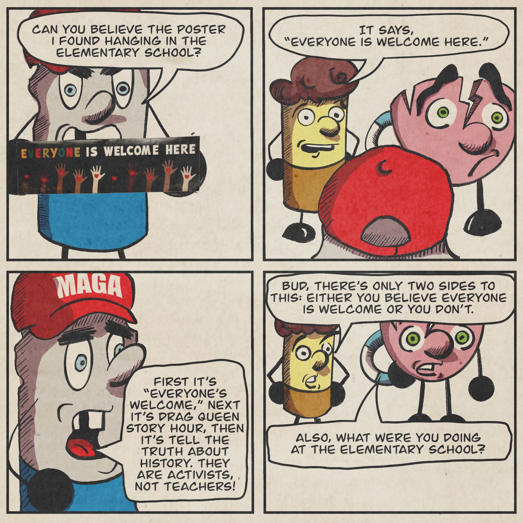 We can’t move forward as a society if we’re only making space for some and not others. No, I’m not saying classrooms should be plastered with personal political opinions. But “Everyone is welcome here” isn’t political. It’s just decent.