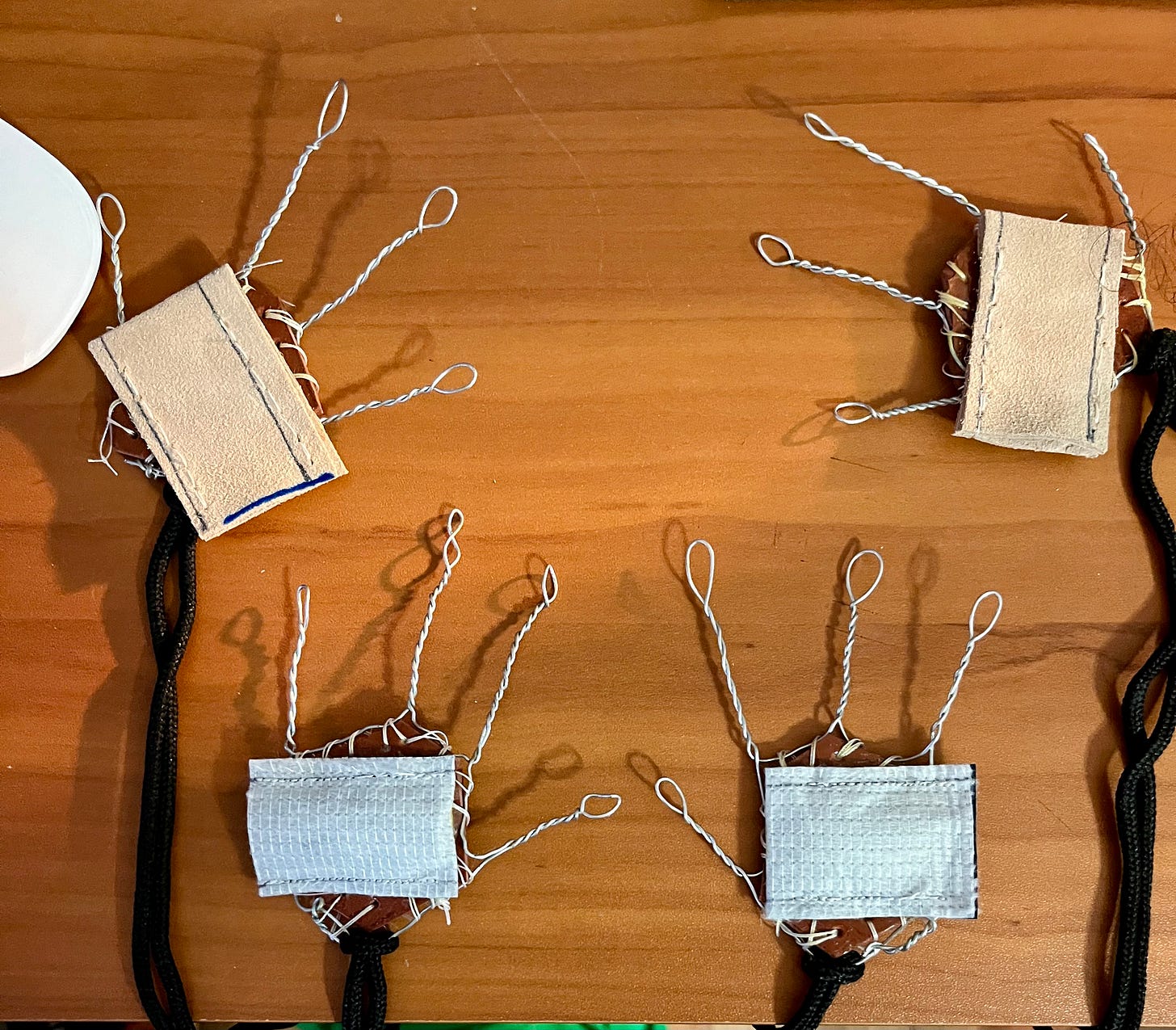 In the palm of each hand is the pocket for the rods that will move the arms. On one pair I have a suede material that I couldn’t get the sewing machine to penetrate, even with the heavy-duty needle. That is probably because of something I was doing wrong. So on the second pair, I took a canvas (I think that is the material) bag we had from LEGOLAND NY and I cut it to make two pockets. The sewing machine did a great job on those two. I then used contact cement to adhere the pockets to the palms. The final part was to attach a shoelace to the hand armature. The shoe laces I picked up at Acme while grocery shopping. They will be used to attach the arms to the body and give it a bit of extra strength.