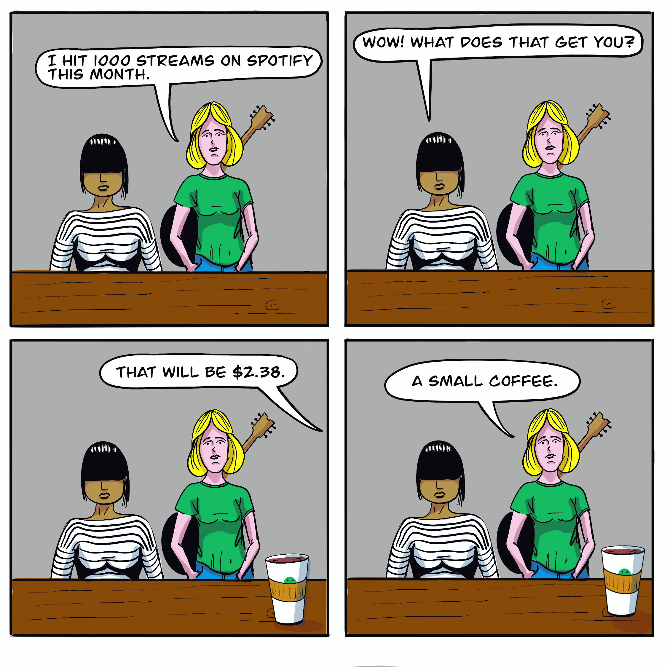 Our journey starts with an unnamed singer-songwriter (she’ll get a name eventually—this isn’t Cheers), sitting at a coffee shop with a friend, beaming over the fact that her song just hit 1,000 streams on Spotify. That glow quickly fades when she realizes her big payout won’t even cover a bagel. If you’ve ever celebrated a creative win, only to realize it comes with no rent money and a side of existential dread—you’re in the right place.