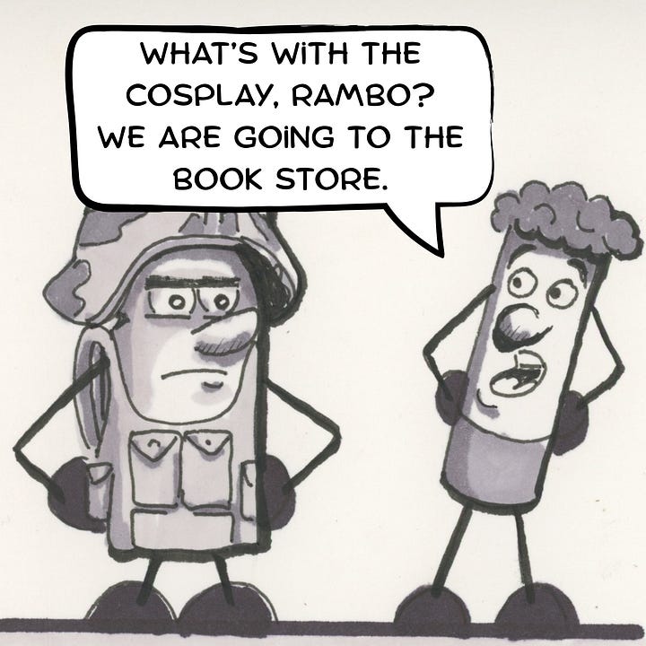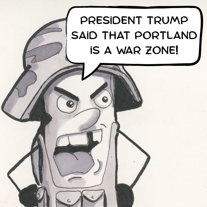 That kind of political exaggeration inspired my latest Bud, Nick, and Joe comic. In it, Bud’s dressed for war. Nick’s confused—because they’re just going to the bookstore. Bud can’t believe Nick hasn’t heard: according to the president, Portland’s a combat zone!