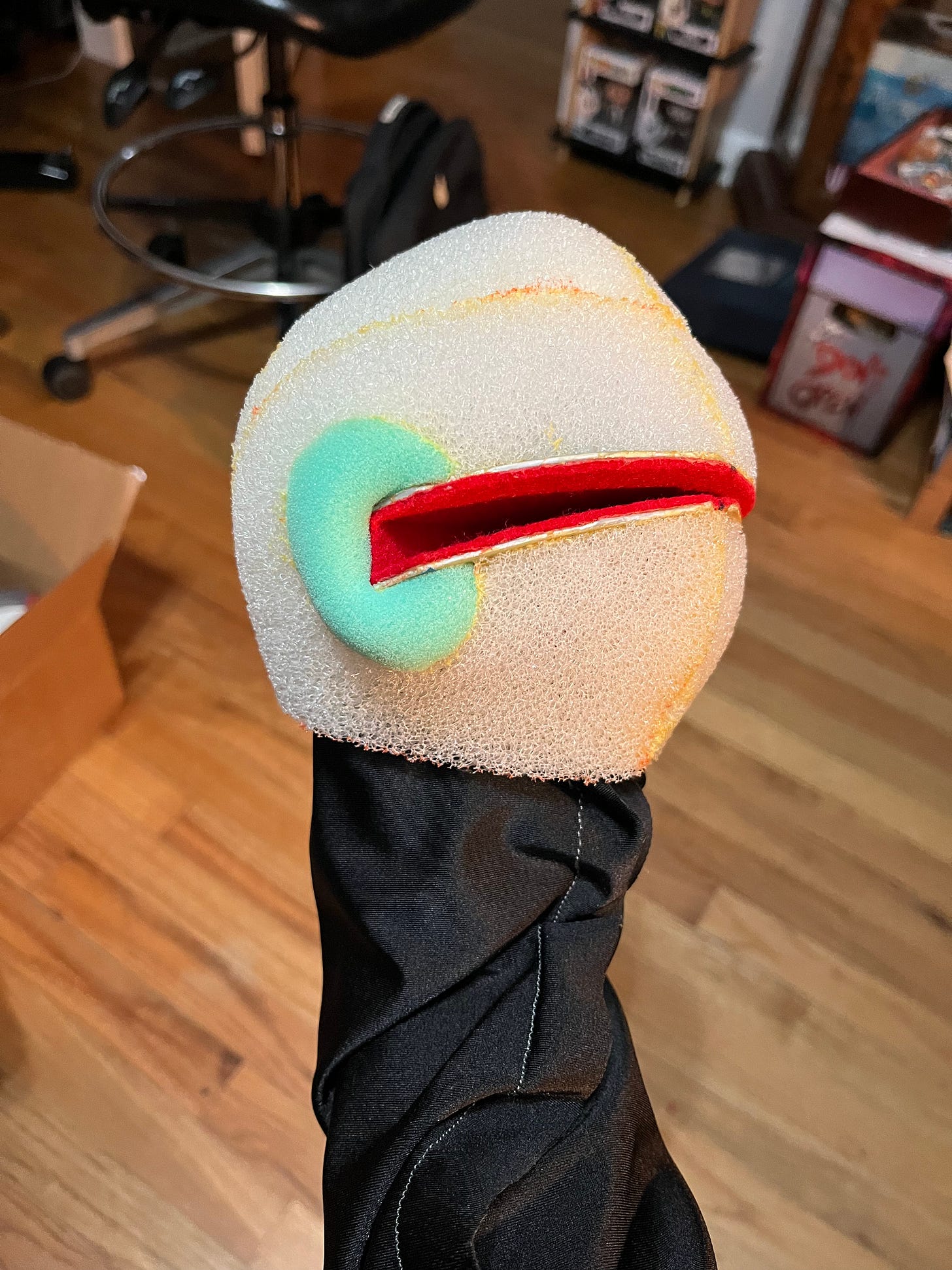 The next phase of the puppet build was creating an arm sleeve out of a spandex material. I bought the supplies from Joann, cut the material to size, and sewed it with my sewing machine. I am still new to hand and machine sewing, which was difficult. It came out slightly sloppy, and I didn’t follow the instructions correctly. It didn’t matter to me since this will never be seen. It will be inside the body. I still need to make a sleeve for the second puppet, and I will try harder to make it a bit cleaner.