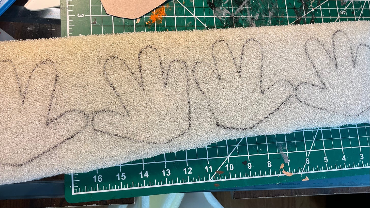 This past week I received the foam and it was the correct foam. So using the pattern for the hand, I cut out 4 (you need two per hand), sandwich the armature into the hands, and glue it all together. I still have another pair of hands to complete and then it is on to the foam arms.