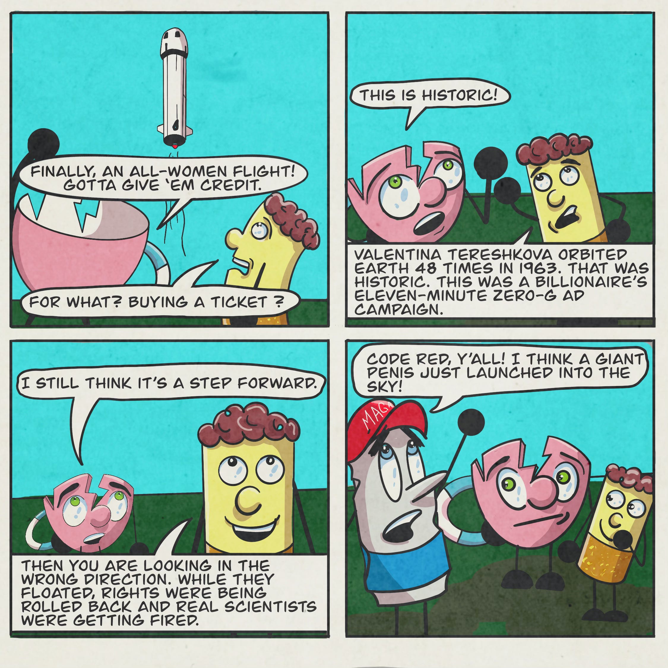 If you want to empower women? Start on Earth. In clinics, classrooms, labs, and courtrooms. Not in a glorified party bus shaped like a penis, blasting into the sky so billionaires can sell us equality they’ve never had to fight for.