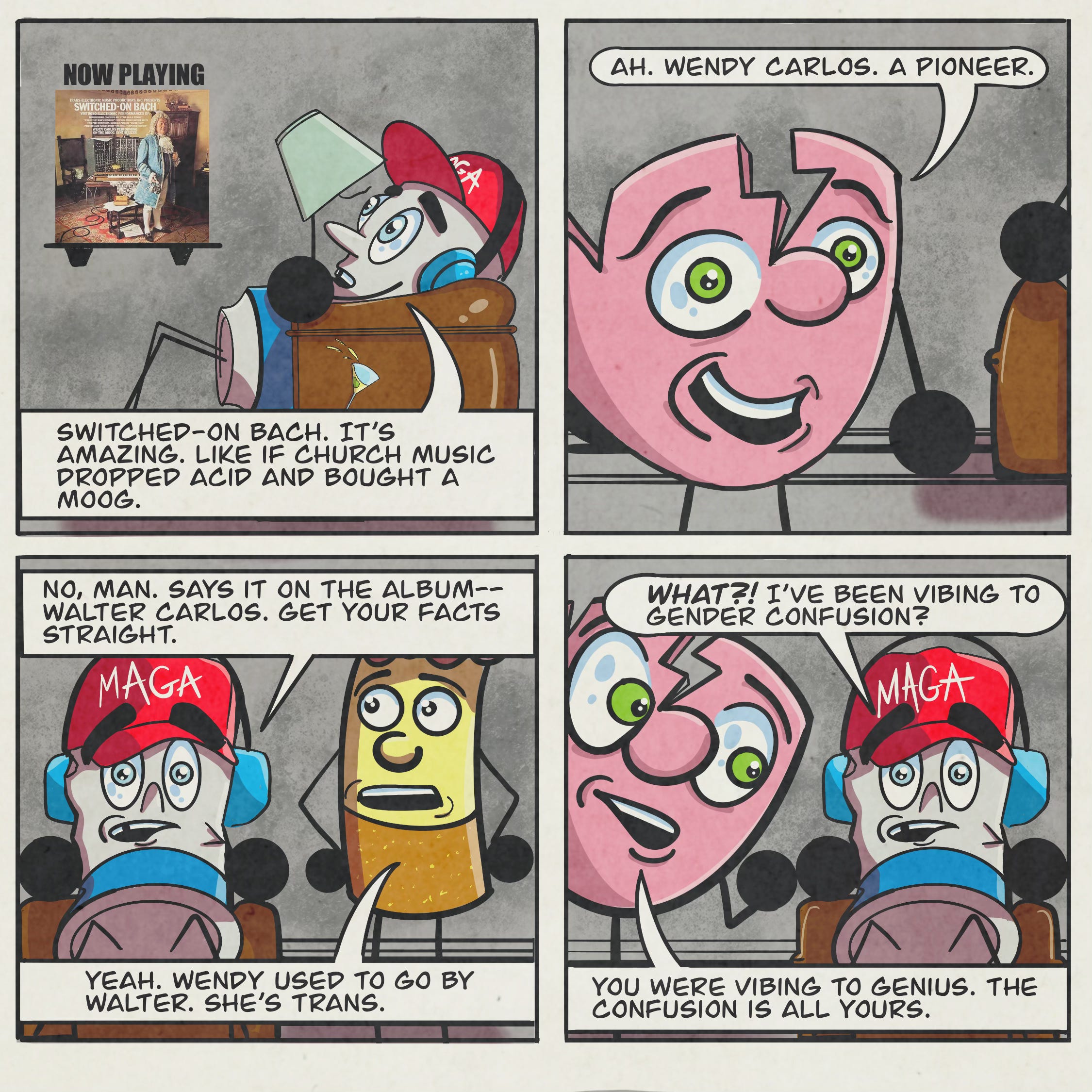 In my comic, Bud enjoys Wendy Carlos’s music—until he learns she’s trans. Suddenly, he feels like the synth has been “tainted.” Like transness is contagious. Joe steps in to remind him that Wendy isn’t the one who’s confused—Bud is. And the only real cure for that confusion is education and exposure. Most transphobia isn’t rooted in experience—it’s rooted in ignorance.